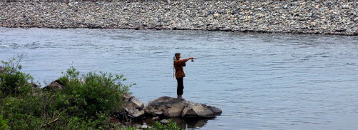た。瀬の頭にある岩にぶつかって二つに分かれた流れの間を漂うように軽くトゥイッチをかけながら流す、重たい流れを